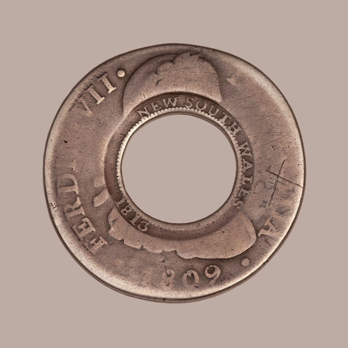 This Holey Dollar is without peer. A Holey Dollar created from a Spanish Silver Dollar that shows no signs of circulation. It begs the question ... as the original silver dollar was minted in Mexico in 1805, how did it avoid usage in the seven years before it arrived in the colony of New South Wales? And how did it avoid usage after it was converted into a Holey Dollar?
