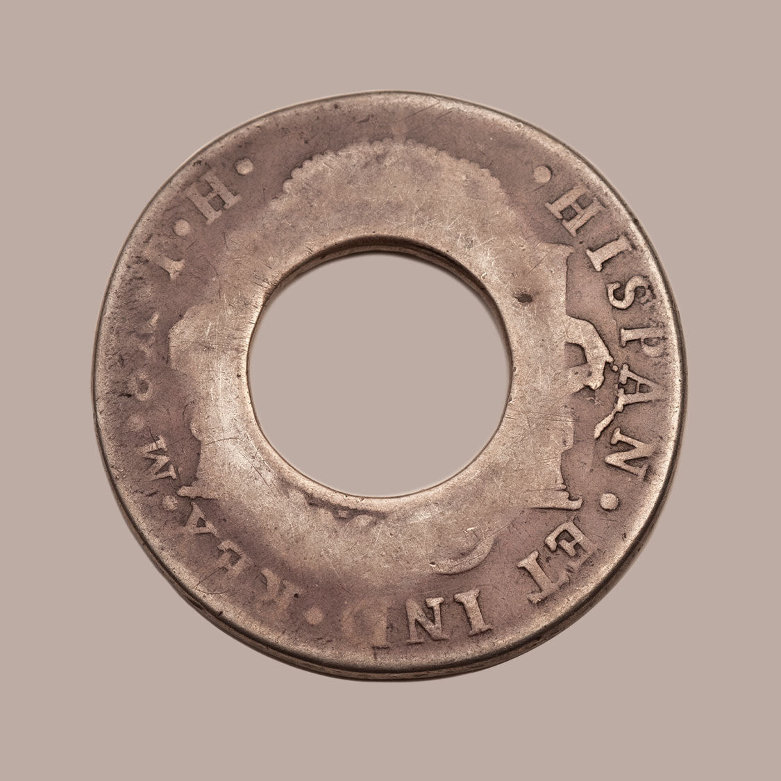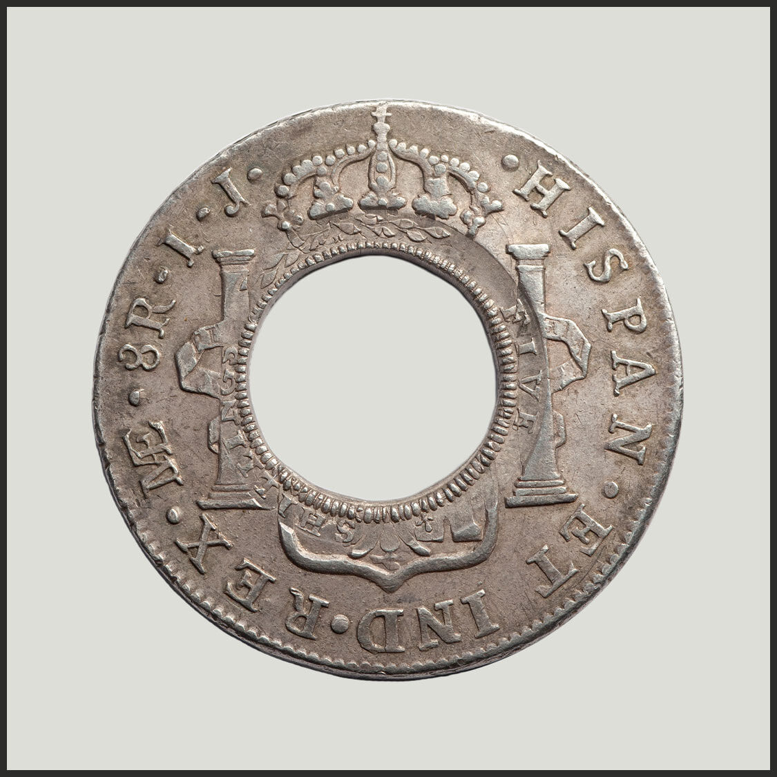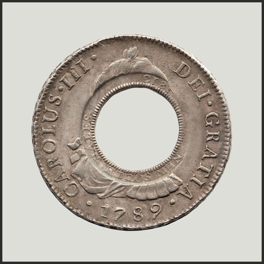 Created from a Spanish Silver Dollar of the 'bust' type depicting the portrait and legend of Charles III. This coin is the finest of twenty two Charles III Holey Dollars.