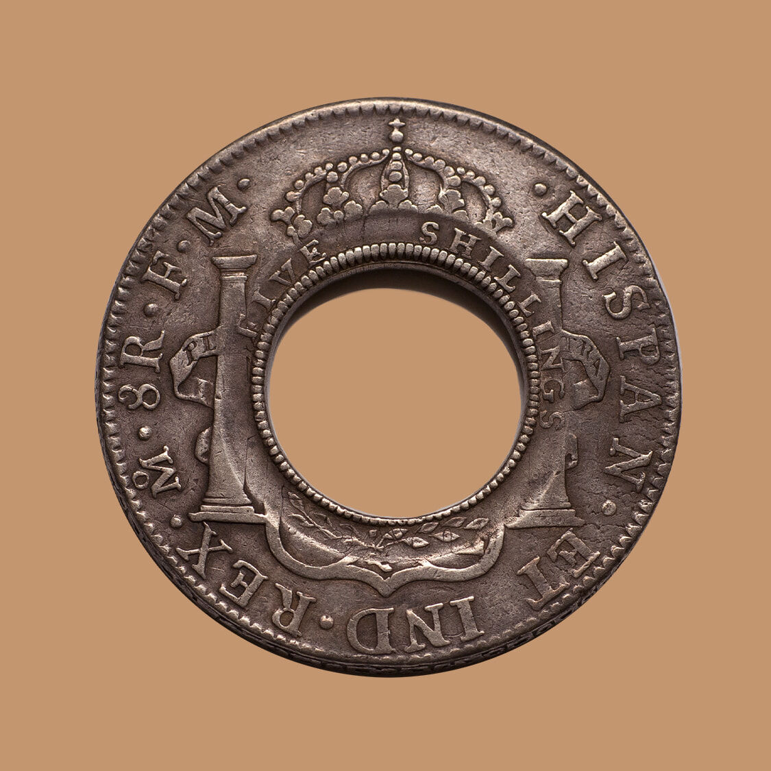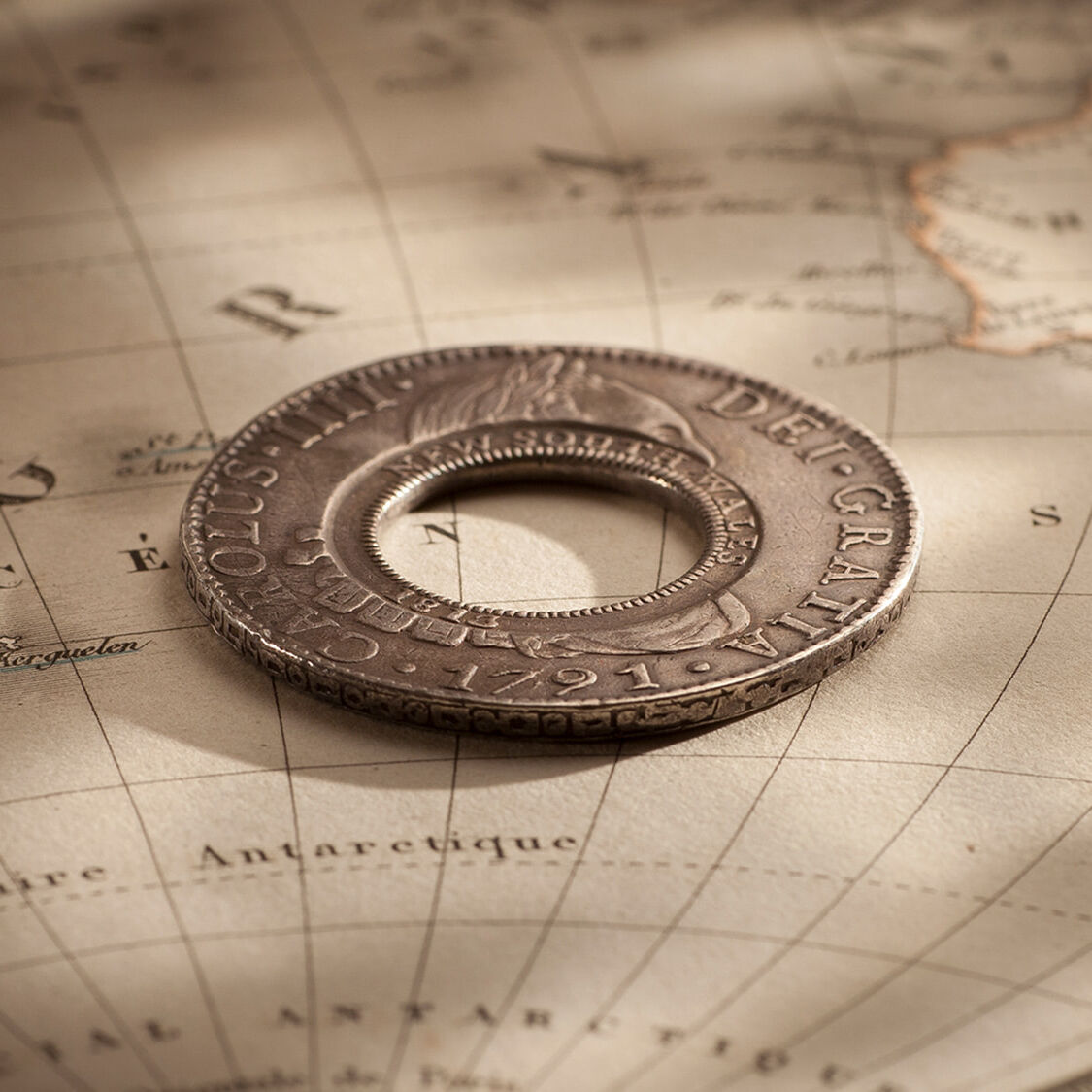 The coin was one of 40,000 Spanish Silver Dollars imported by Lachlan Macquarie to use as the basis of the colony's first currency.