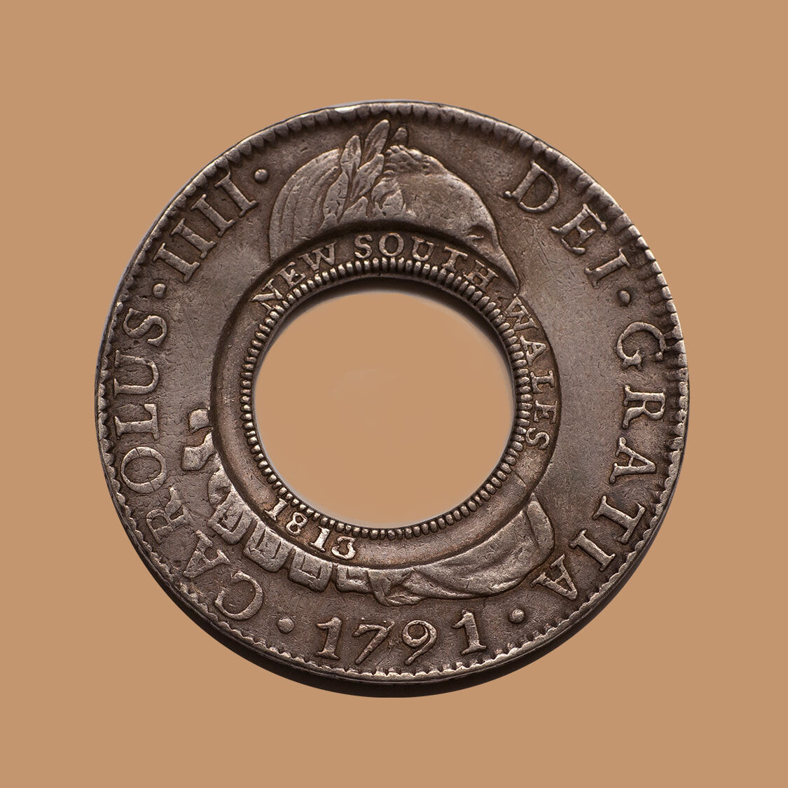 When Mint Master William Henshall created this Holey Dollar, he grabbed a Spanish Silver Dollar that had been struck at the Mexico Mint in 1791. The dollar depicted the portrait of King Charles IV.