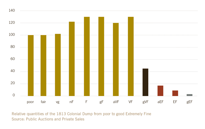 The graph (and we refer you to the gold areas) clearly shows that the 1813 Dump is reasonably readily available up to, and including, a quality level of Very Fine. What is also obvious from the graph is that Good Very Fine is the point at which extreme rarity kicks in.