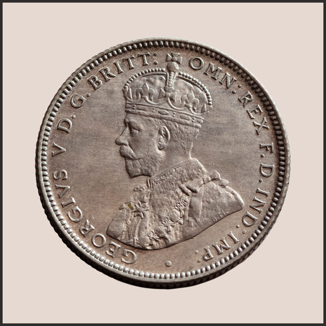 • The testing of a reduced silver alloy commenced in 1918 with the striking of this 1918 Shilling. Struck in .500 fine from the currency dies, the reverse die was punched in the field with two irregular stops on either side of the date.