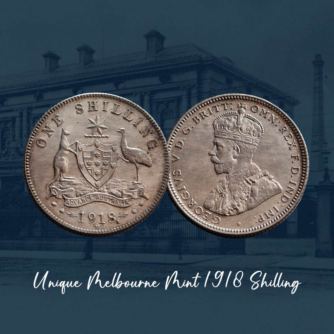 This 1918 Shilling is the only known example held by a private collector. The coin comes with a distinguished pedigree, its first recorded owner, Mr A M Le Souef, a former Deputy Master of the Melbourne branch of the Royal Mint London. It was especially struck at the Melbourne Mint as a test piece, in a reduced metal content of .500 fine silver. And to differentiate it from the circulation issue, the reverse die was punched in the field with two irregular stops on either side of the date. The coin was considered so important that when a second example came to light in 1991, and was offered at Spink Auctions Australia, it was acquired by the Museum of Victoria for their collection, where it is still held.